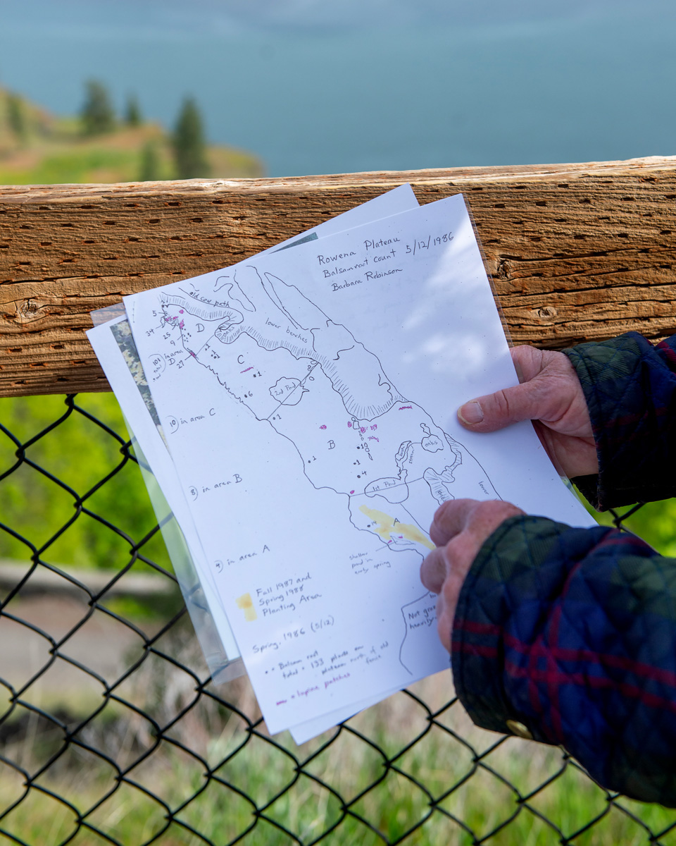 Purchasing the Rowena Plateau land marked the start of Barbara’s involvement in fighting for its preservation and for the wildflowers and native plants that inhabited it. In 1985 she raised the money to buy the 64-acre hilltop south of the plateau (McCall Point) for the Nature Conservancy. And in 1988 she started a formal experiment with the Nature Conservancy on the Tom McCall Preserve—a survey where she planted 760 balsamroot seeds in 23 test plots on the preserve. The goal was to see if the native sunflower could be reestablished from seed, and how much and how far the seeds would reproduce and spread over a certain period.