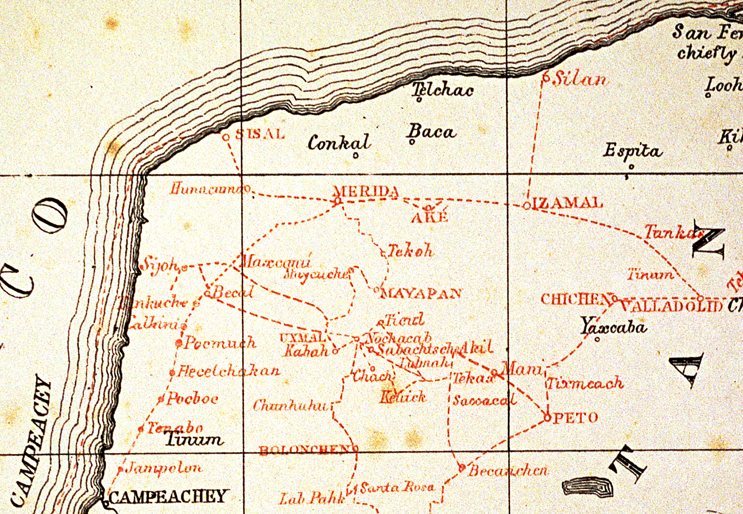 Detail of map at left; northern Yucatan, showing location of Uxmal, Kabah, and Labnah.     1844  (chromolithograph)