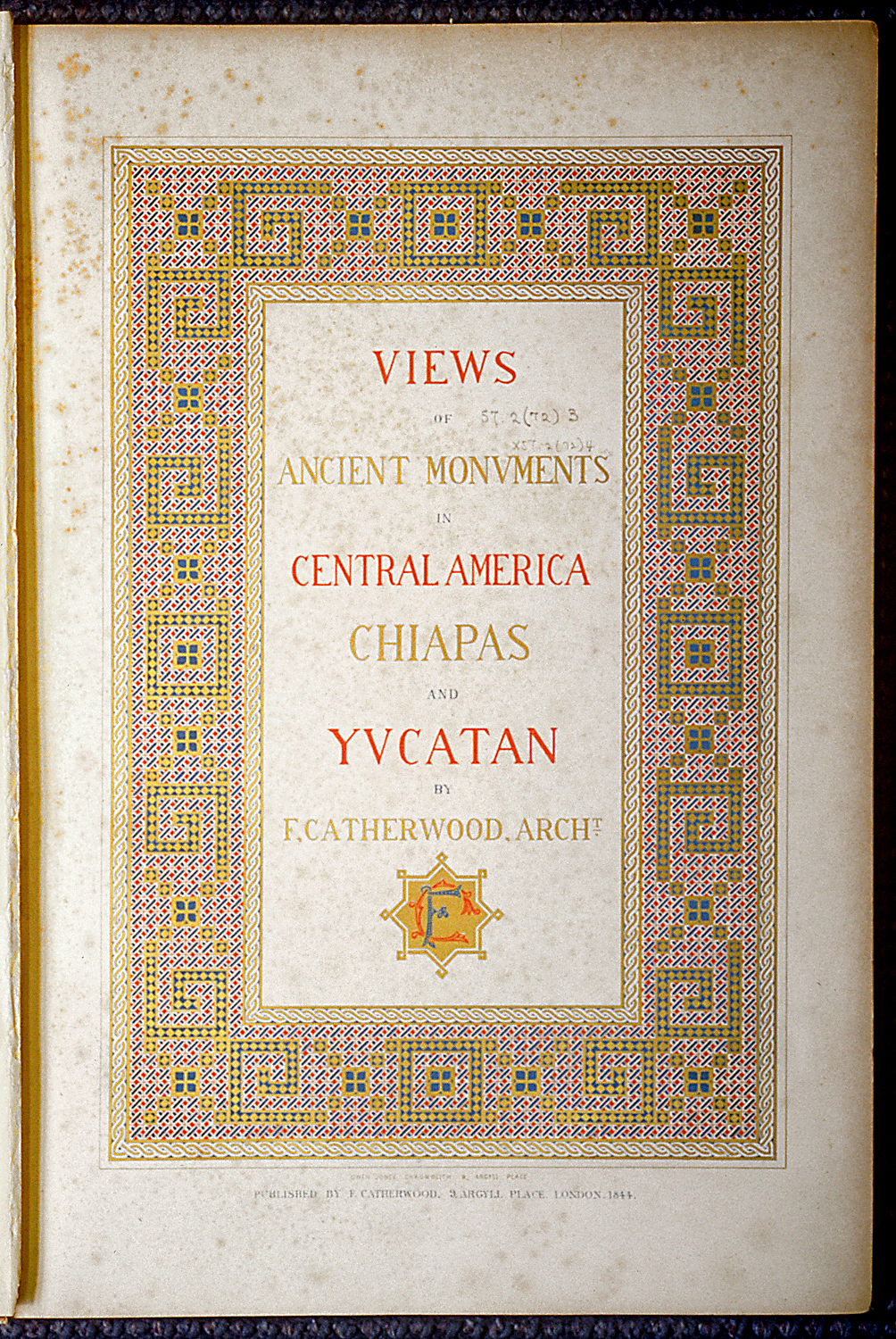 Title page: Views of Ancient Monuments in Central America, Chiapas, and Yucatan, by F. Catherwood, Archt.; "Owen Jones Chromolith. 9, Argyl Place; Published by F. Catherwood, 3 Argyll Place. London, 1844."   1844  (chromolithograph)
