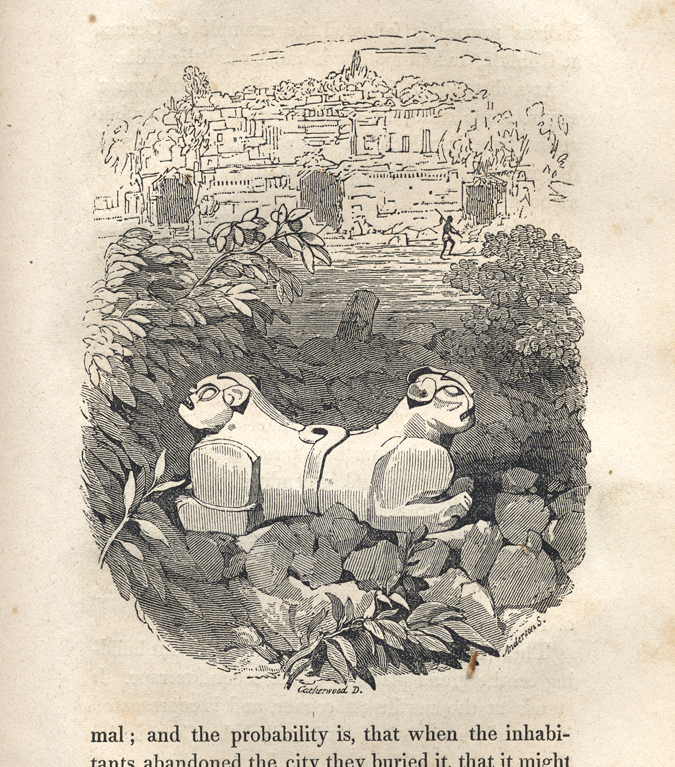Vol.I, p.183: Sculpture of a double-headed cat or lynx, in front of Casa del Goberador, Uxmal.   1843