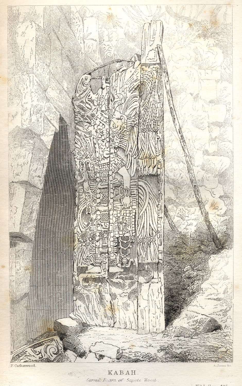 Vol.I, facing p.405: "Kabah. Carved Beam of Sapote Wood. / F. Catherwood., A Jones Sc." Building of the Red Hands, lintel removed from other doorway, shown here propped up on end for drawing.   1843