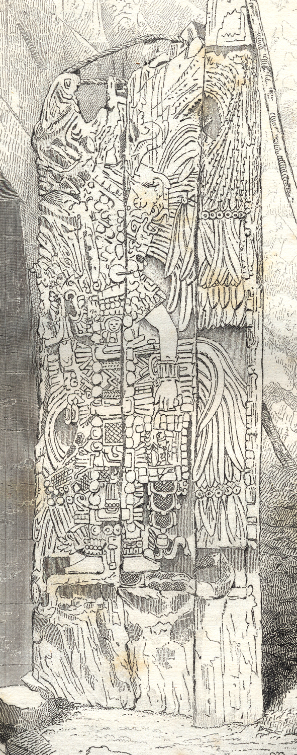 Detail of carved lintel in drawing above, far-right; 2 beams, the one at right split in 2; an elaborately garbed royal figure standing on a serpent.   1843