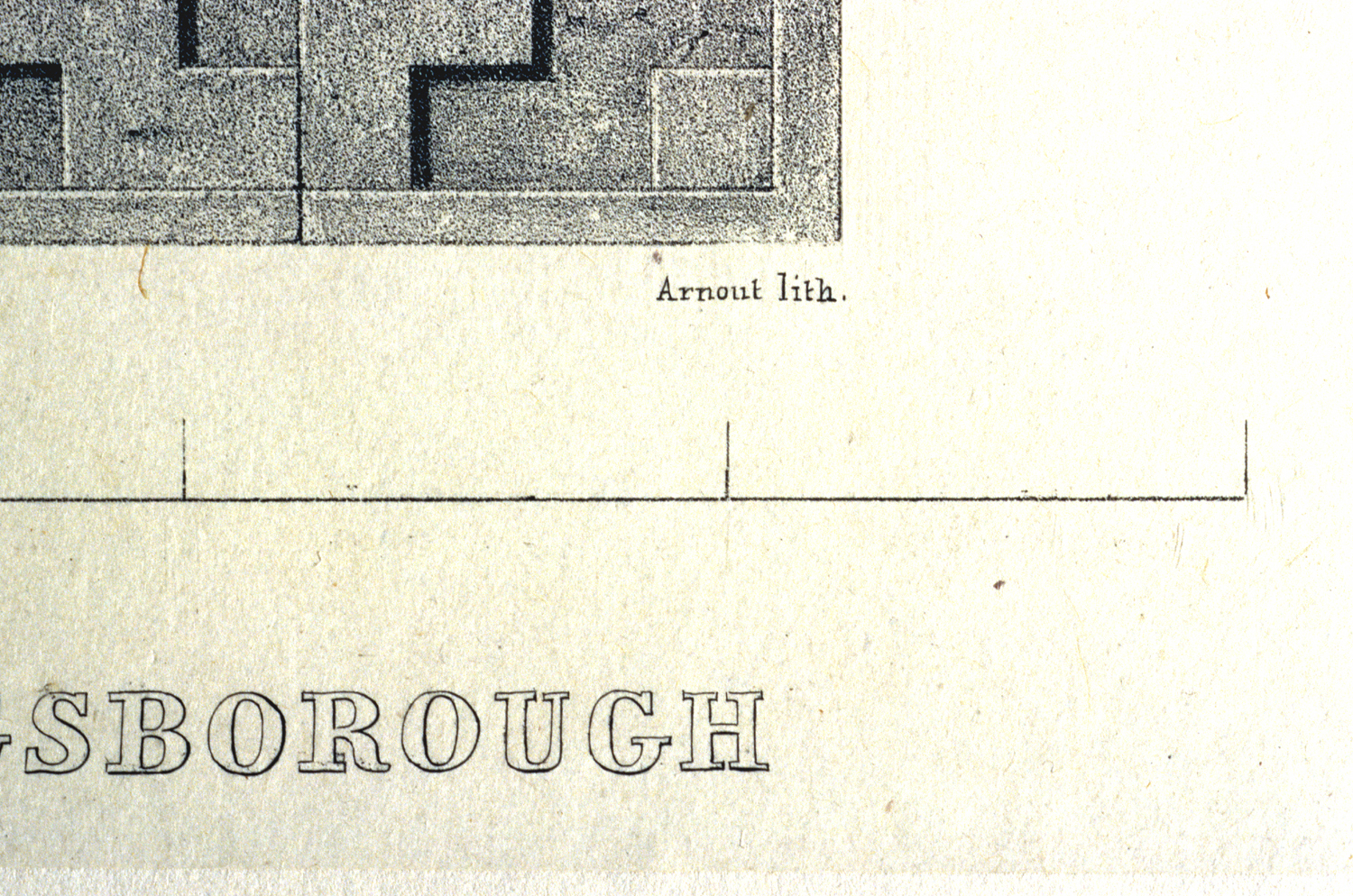Detail of print above-far-left, showing "Lithographer Arnout".   1838