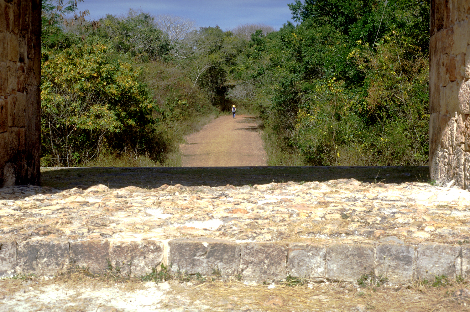 Looking north through arch to sacbé, artificial roadway.     Jan. 2001