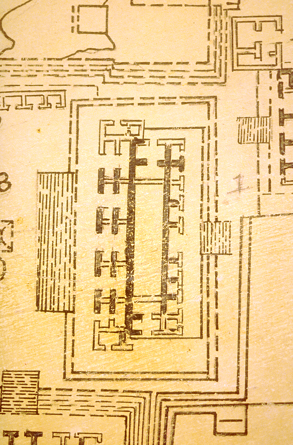 Detail of map at left, showing rooms at back of Codz Poop, terrace surrounding Codz Poop, and narrower central staircase at back.      Jan. 2002
