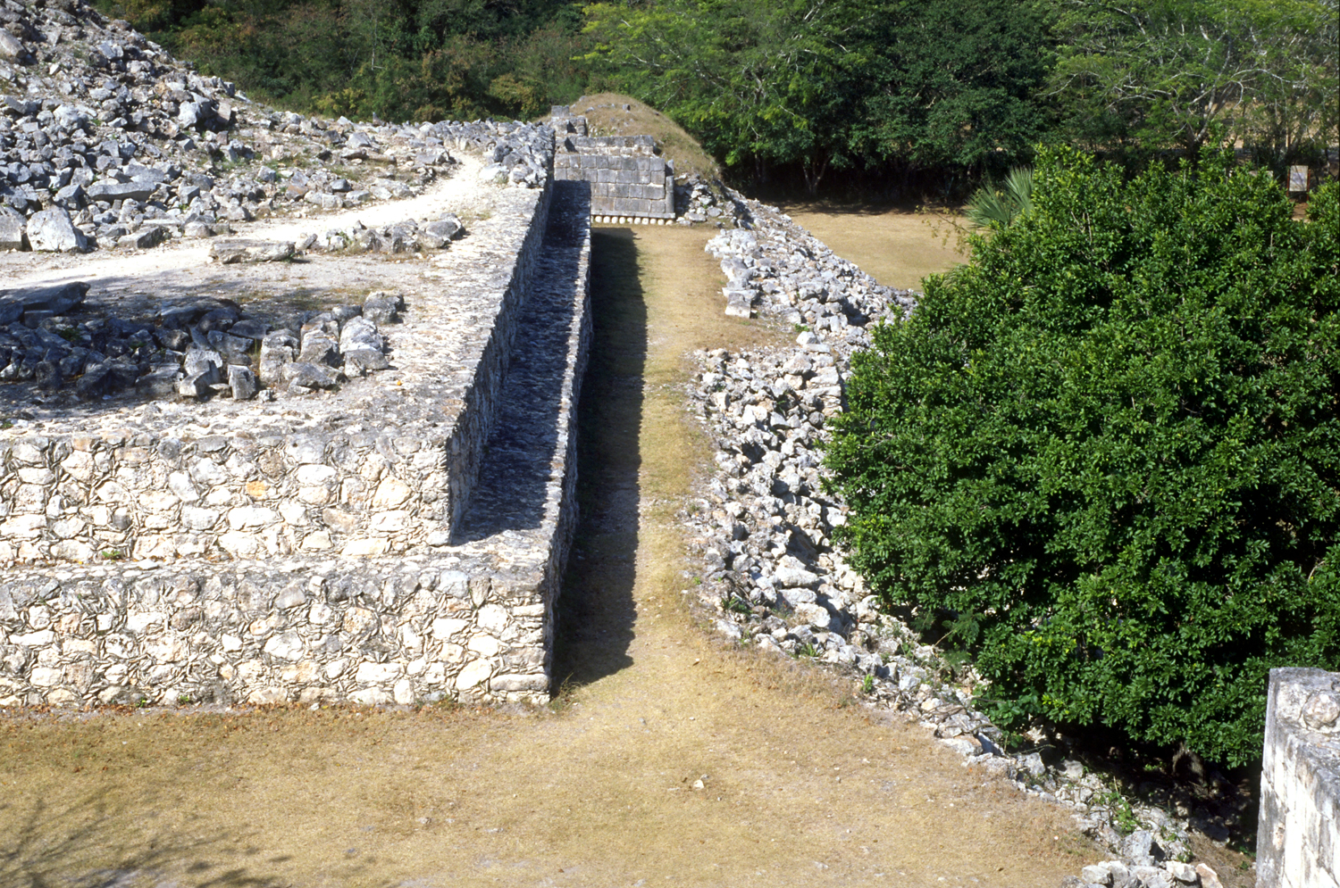 Stepped walls of north end of terrace, looking down over top edge of Codz Poop Platform.       Jan. 2001