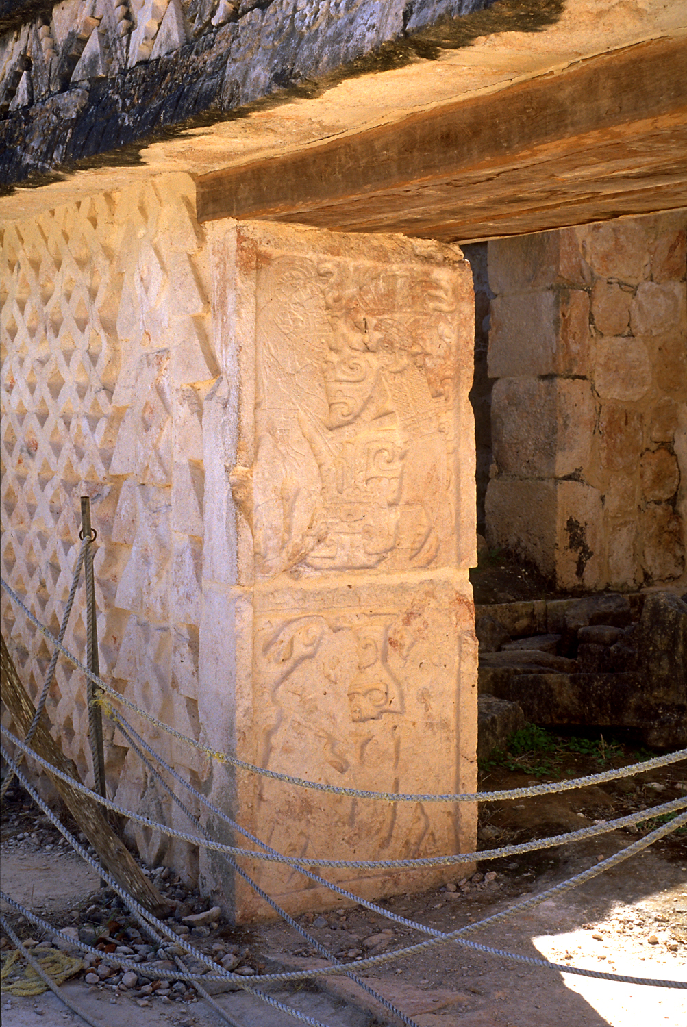 Left doorjamb; the upper and lower halves are seemingly separate stones with separately framed panel style reliefs; modern wooden lintels.