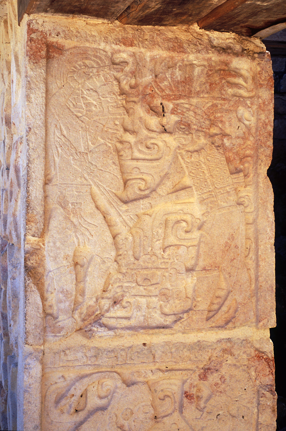 Upper half of doorjamb in photo at left, possibly representing triumphal celebration; left figure possibly a King of Kabah, the right figure with facial scarification wears a patterned sleeveless jerkin.       Jan. 2001