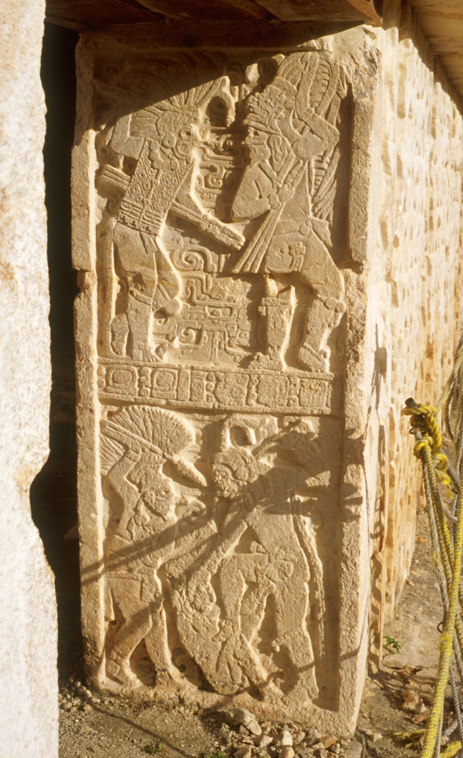 Right doorjamb, a single stone, panel style with separately framed reliefs above and below.       Jan. 2002