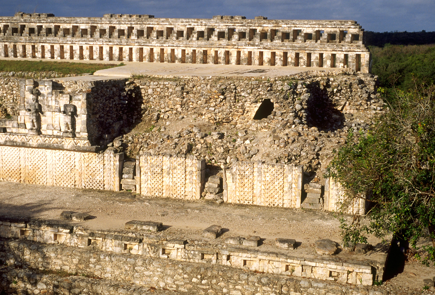 Northeast corner of Codz Poop, largely collapsed, showing location of three doorways and surrounding terrace.       Jan. 2001