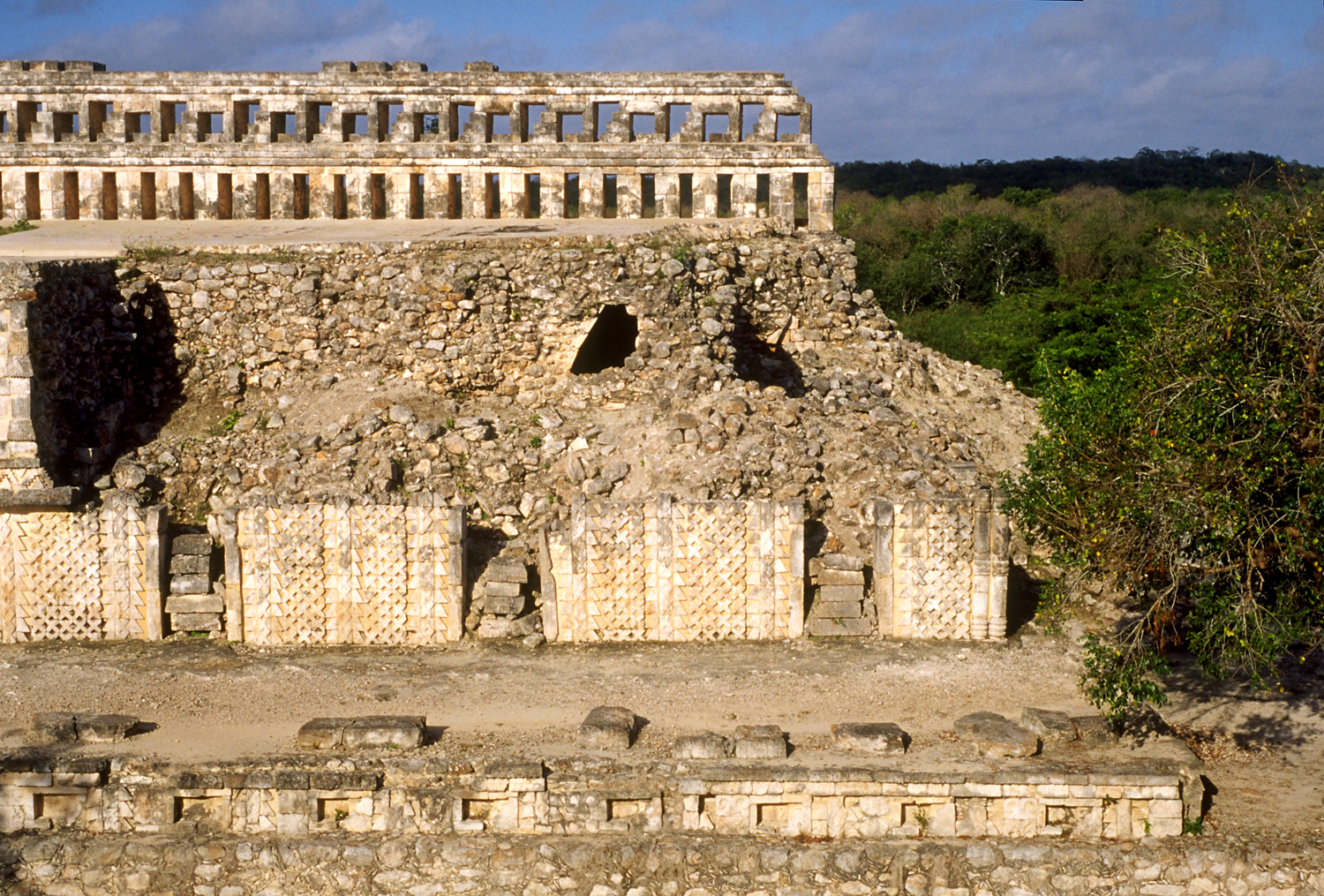 Same area as photo at left; lower two tiers of roofcomb largely restored, stepped fret design in upper tier.       Jan. 2001