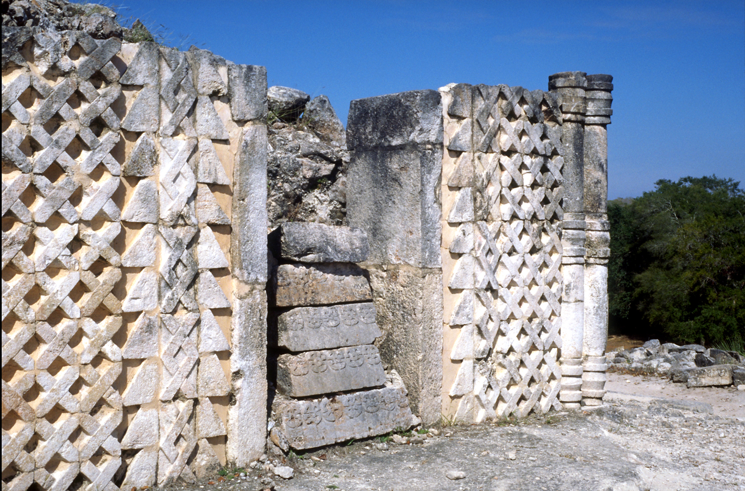 Partly reconstructed north end of lower facade, with doorway jamb stones and engaged banded spool columns at corner.       Nov. 1999