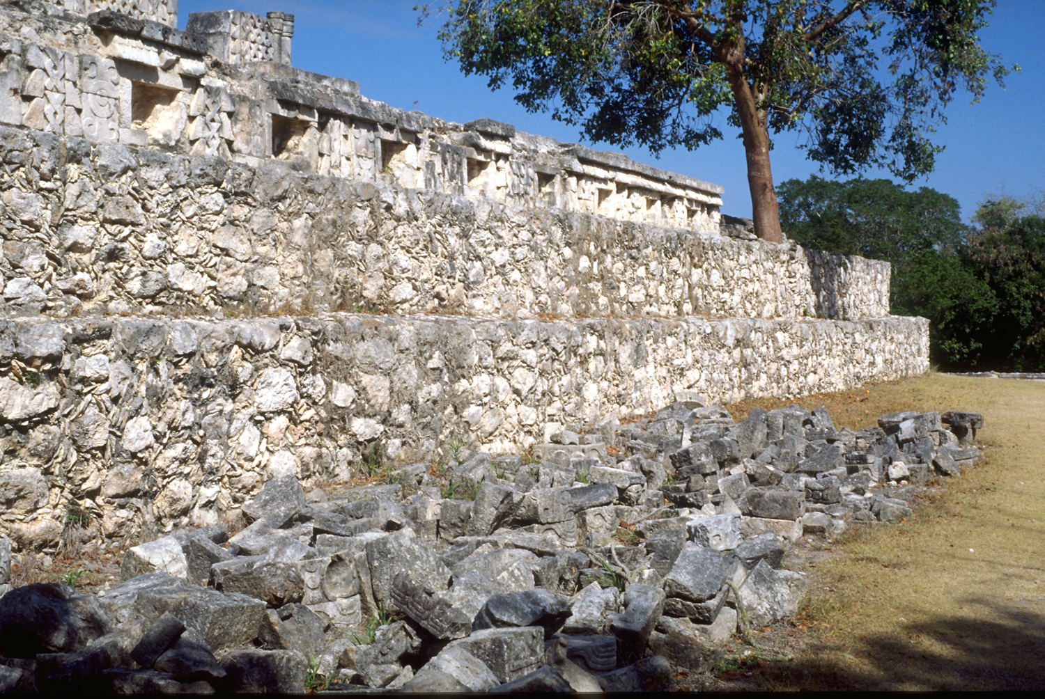 Stepped back walls of Codz Poop terrace, fallen facade stones on ground.       Jan. 2001