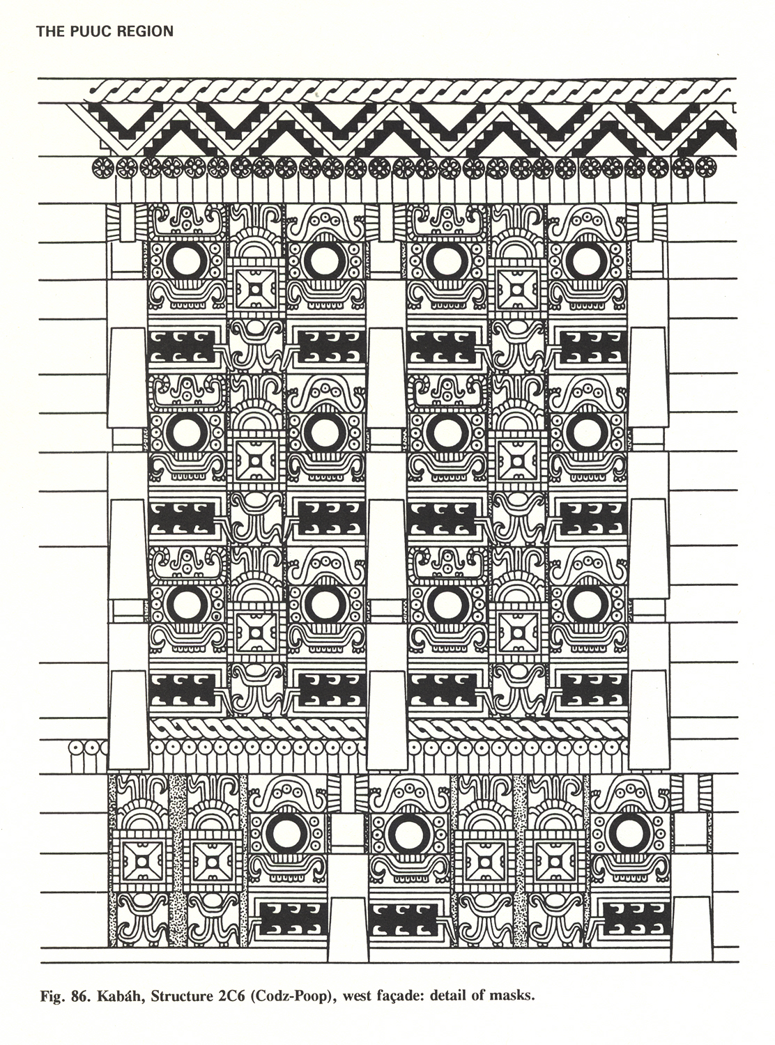 "Kabáh, Structure 2C6 (Codz-Poop), west facade: detail of masks."