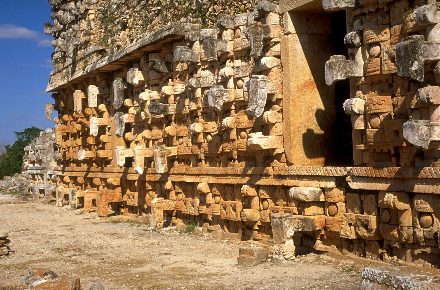 North half of lower facade showing projecting, broken snouts; central doorway at right.       Jan. 2001
