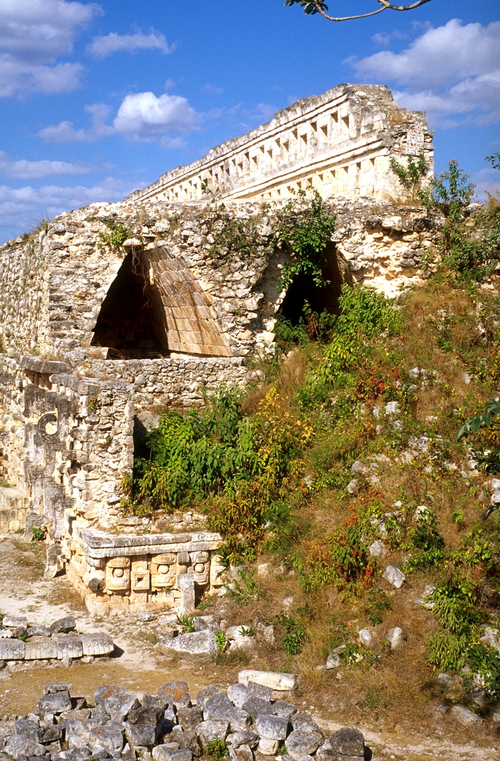 Showing surviving vaults of 2 partly collapsed rooms, front and back. The roofcomb, restored, is built on top of solid masonry core behind the rows of outer and inner rooms.       Jan. 2001