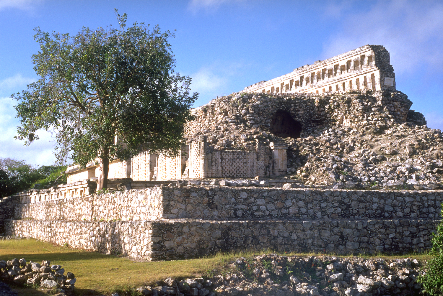 Northeast corner of Codz Poop Platform, on higher ground so less tall than northwest corner. Corner reconstructed, northeast corner of Codz Poop largely collapsed.       Jan. 2002