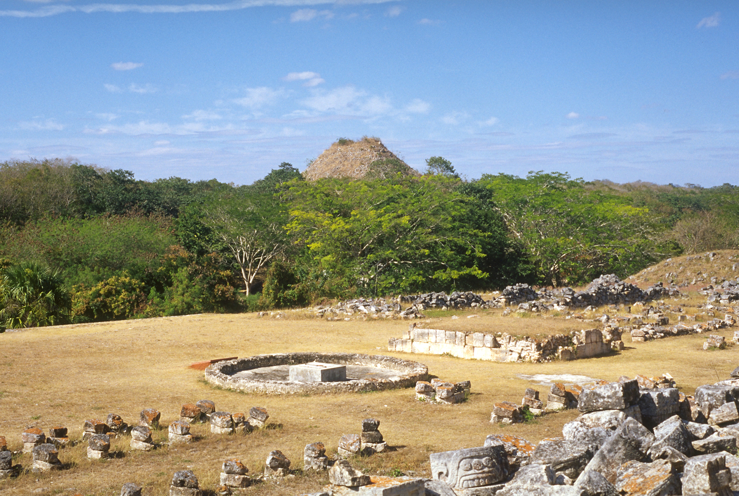 Terrace with chultune near center; the squarish altar toward right. Great Pyramid in the distance.       Jan. 2001