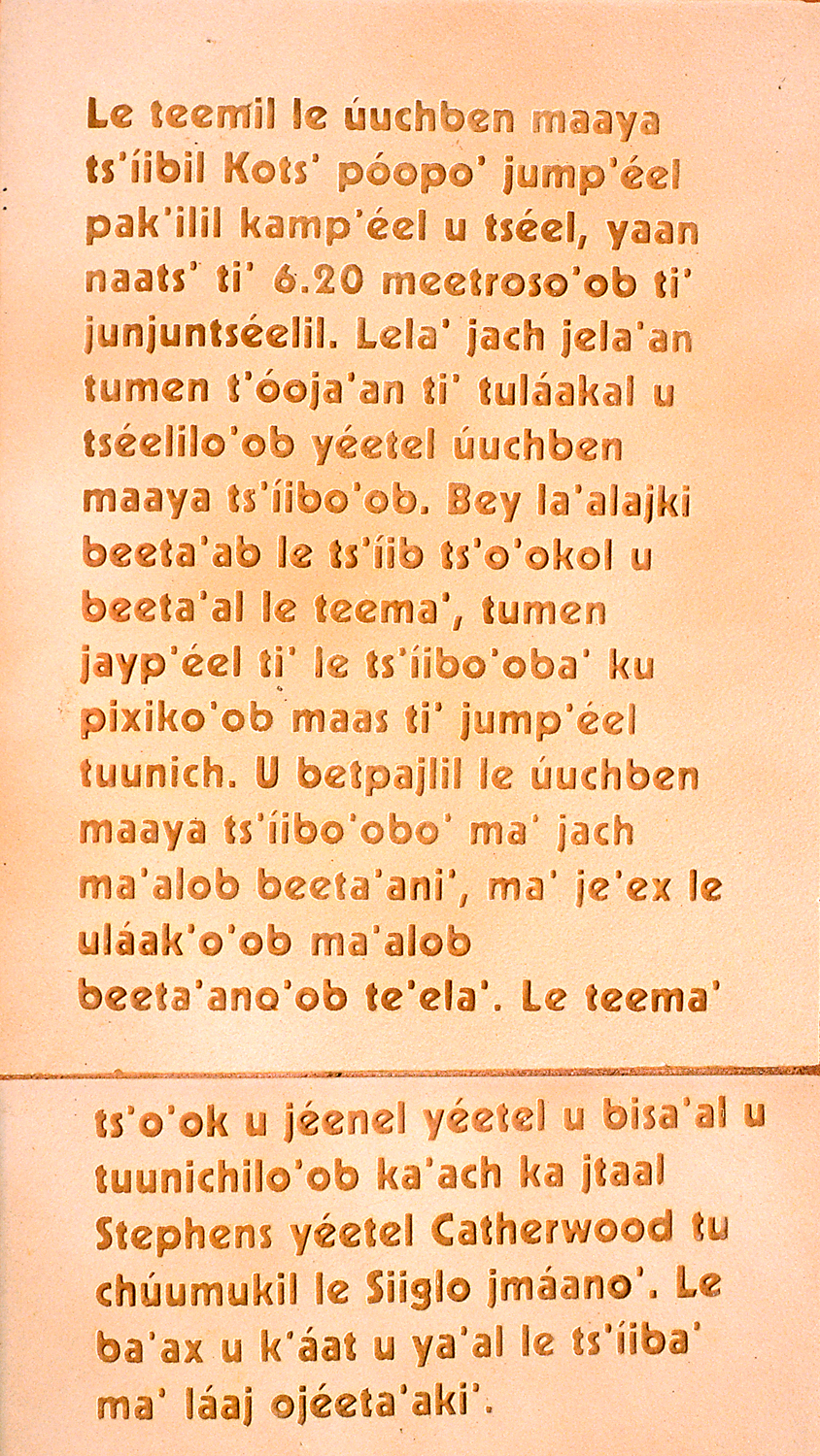 Detail of INAH plaque above-center; Yucatec Mayan description.      Jan. 2003