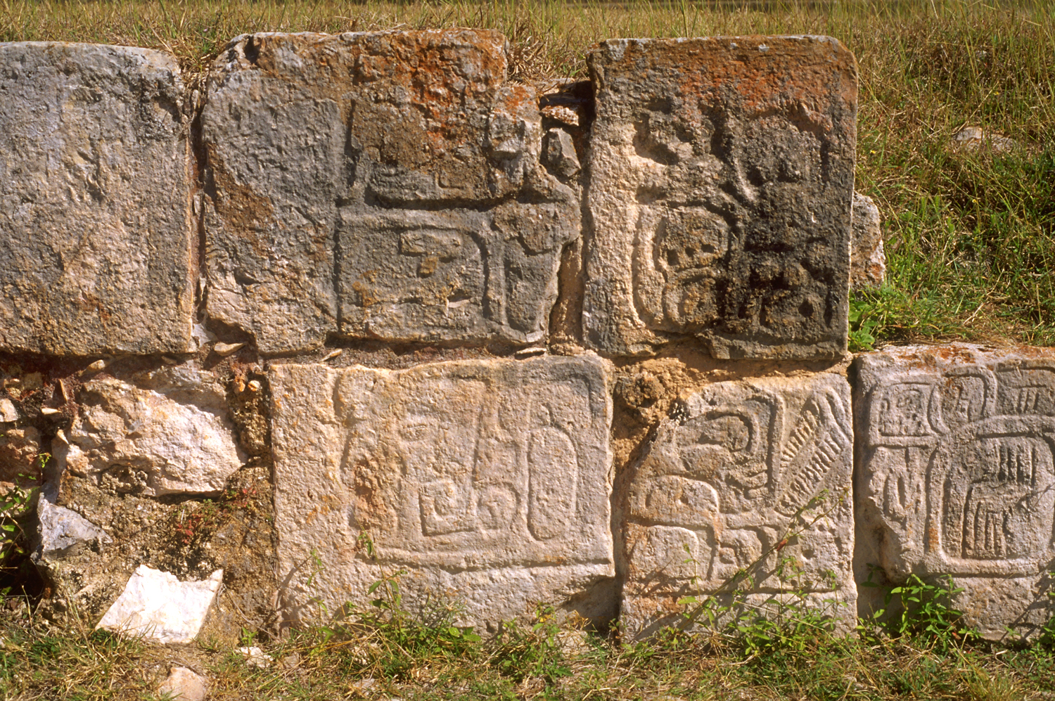 Detail of photo above-far right; female head glyph in center of bottom row; God B glyph above in upper row.       Jan. 2002