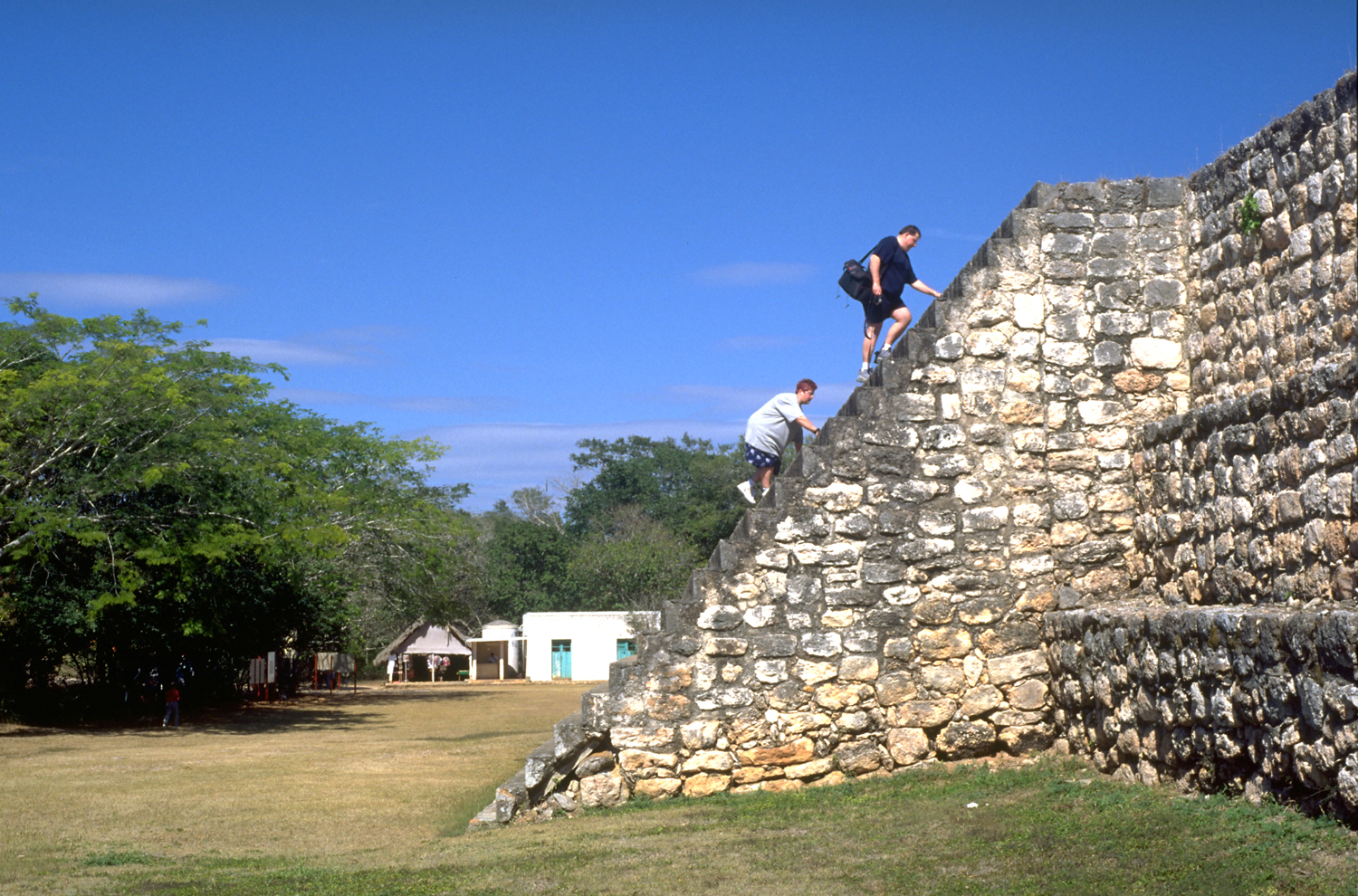 Tourists climbing steep main (west) staircase to top of Codz Poop Platform.       Jan. 2001