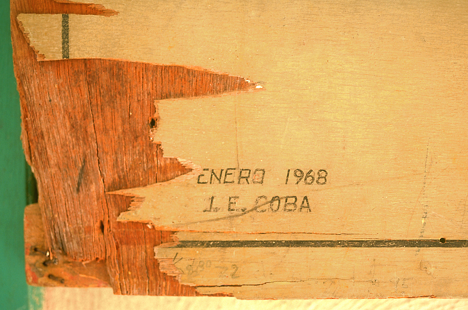 Inscribed "ENERO [January] 1968 / J. E. COBA"; the surface of board chipping off.       Jan. 2002