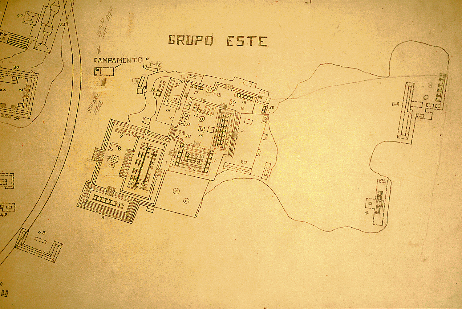 East Group; modern highway, at left, cuts through the archaeological site. Codz Poop and Palace in center; Temple of the Columns at far right.