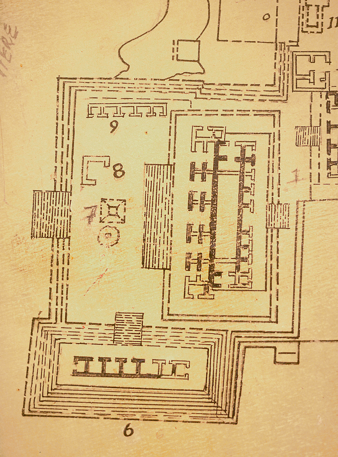East Group; detail showing Codz Poop with its terrace on the Great Platform and Structure 2B3 at bottom.       Jan. 2002
