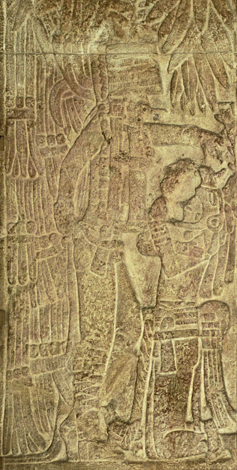 Detail of doorjamb in photo at far left. Compared with other Maya sculpture, the 2 standing kings are uncharacteristically slender.               April 2002 (flash)