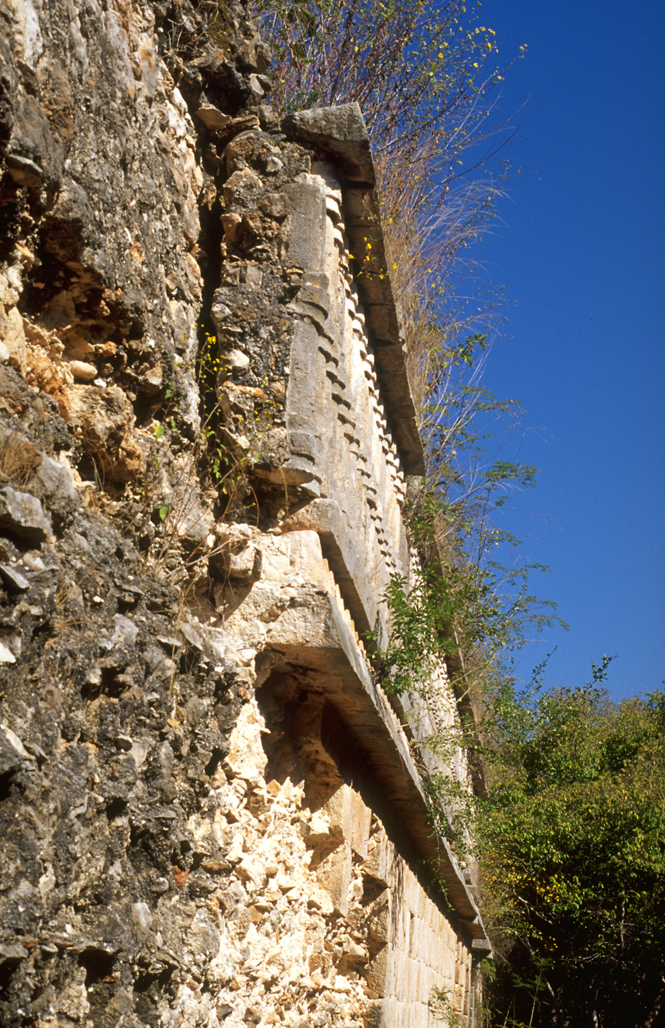 Sections of frieze colonnette and moldings survive above fallen facing stones below.       Jan. 2001