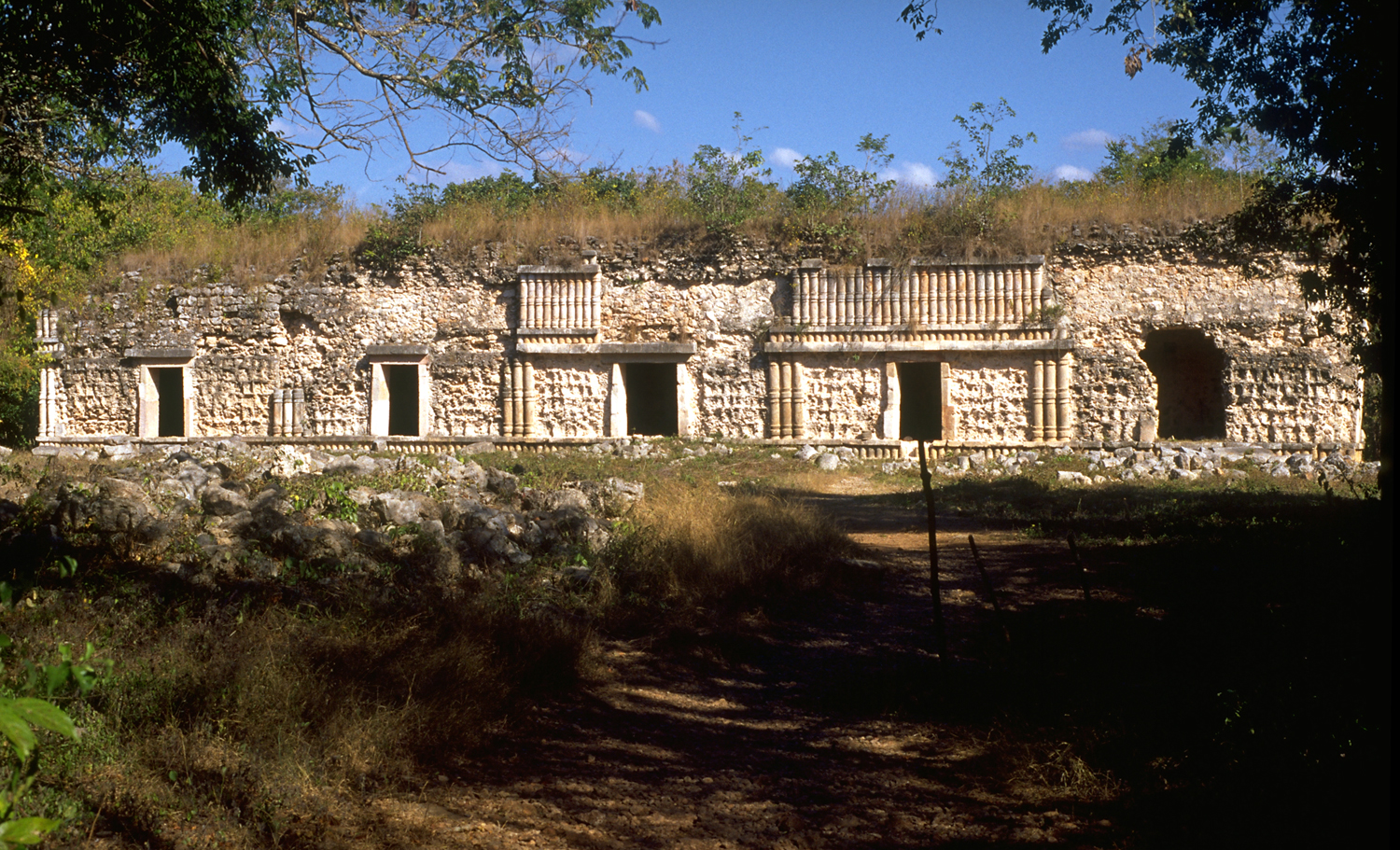 Front (west) facade with five doorways; cleared and restored 1953.  Jan. 2001