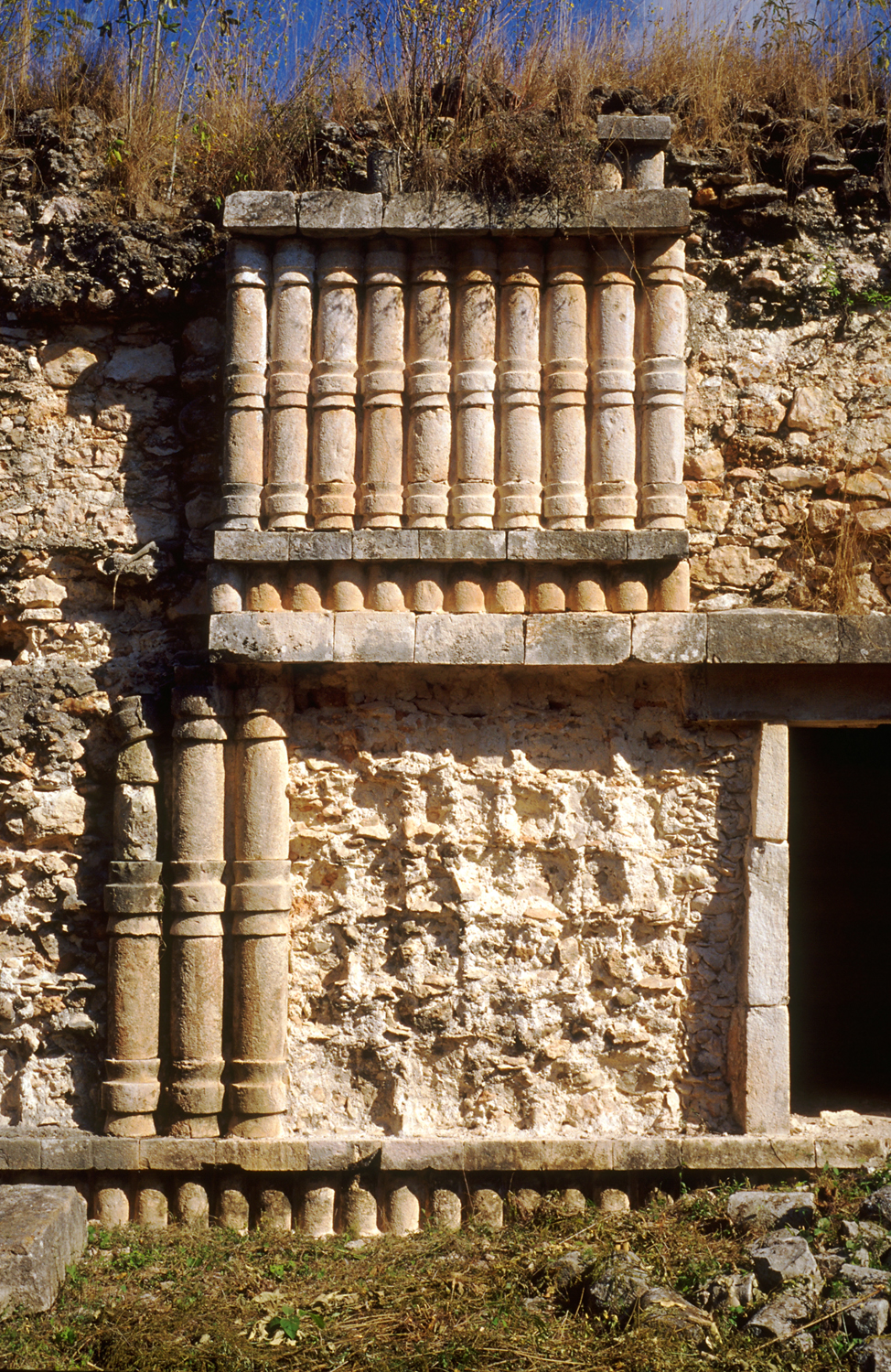 Clear example of mortar binder covering rubble-cement wall, from which facing stones, have fallen or been removed. They were impressed but not deeply tenoned into wall.       Jan. 2001
