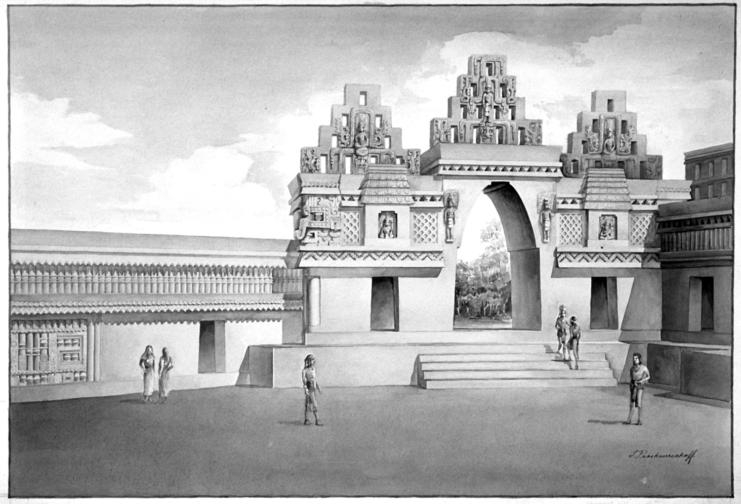 Watercolor reconstruction drawing by Tatiana Proskouriakoff, 1946; scanned from 35mm slide of the original watercolor drawing. Reproduced Courtesy of the Peabody Museum of Archaeology and Ethnology, Harvard University.