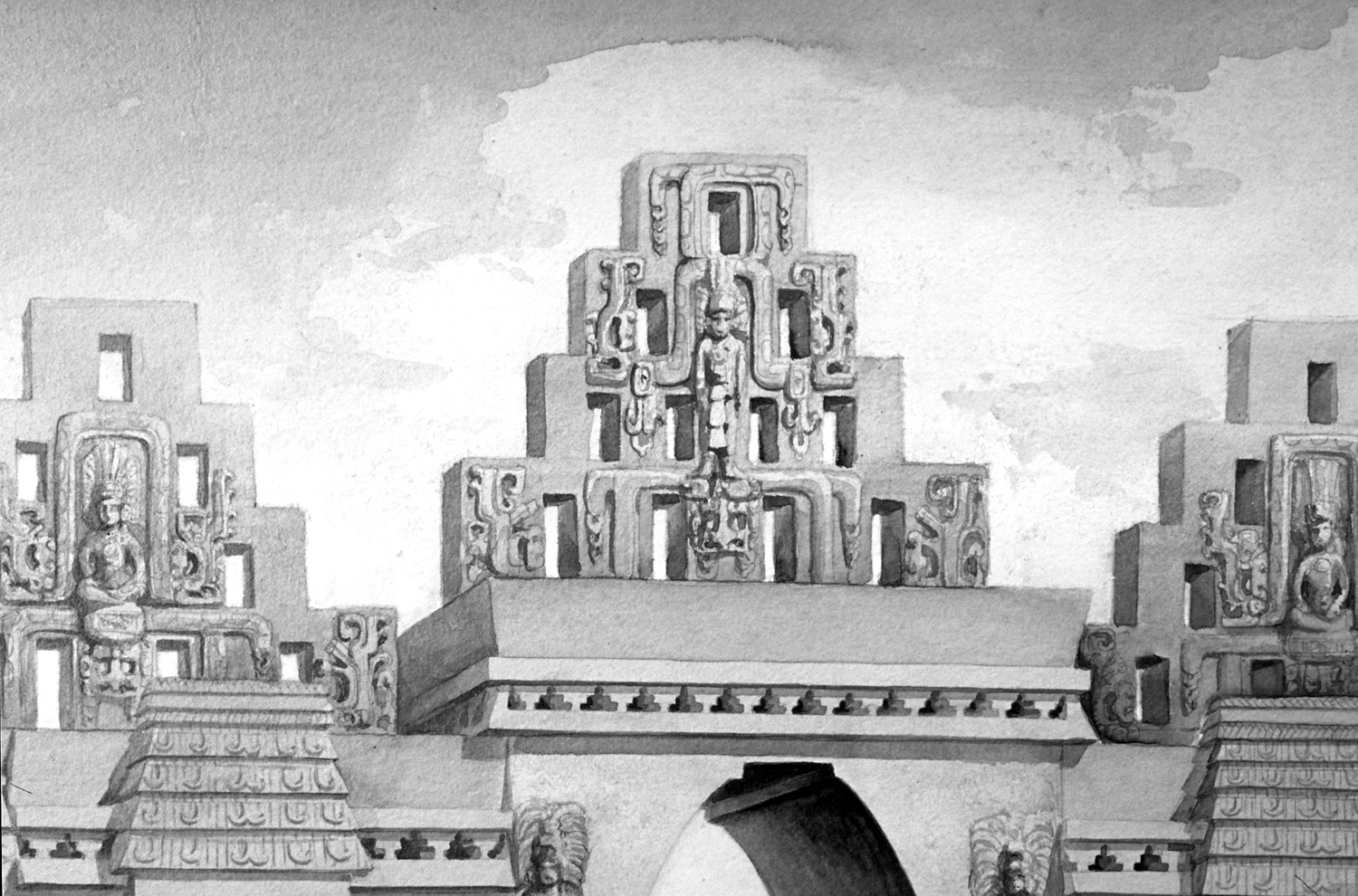 Watercolor reconstruction drawing by Tatiana Proskouriakoff, 1946; scanned from 35mm slide of the original watercolor drawing. Reproduced Courtesy of the Peabody Museum of Archaeology and Ethnology, Harvard University.