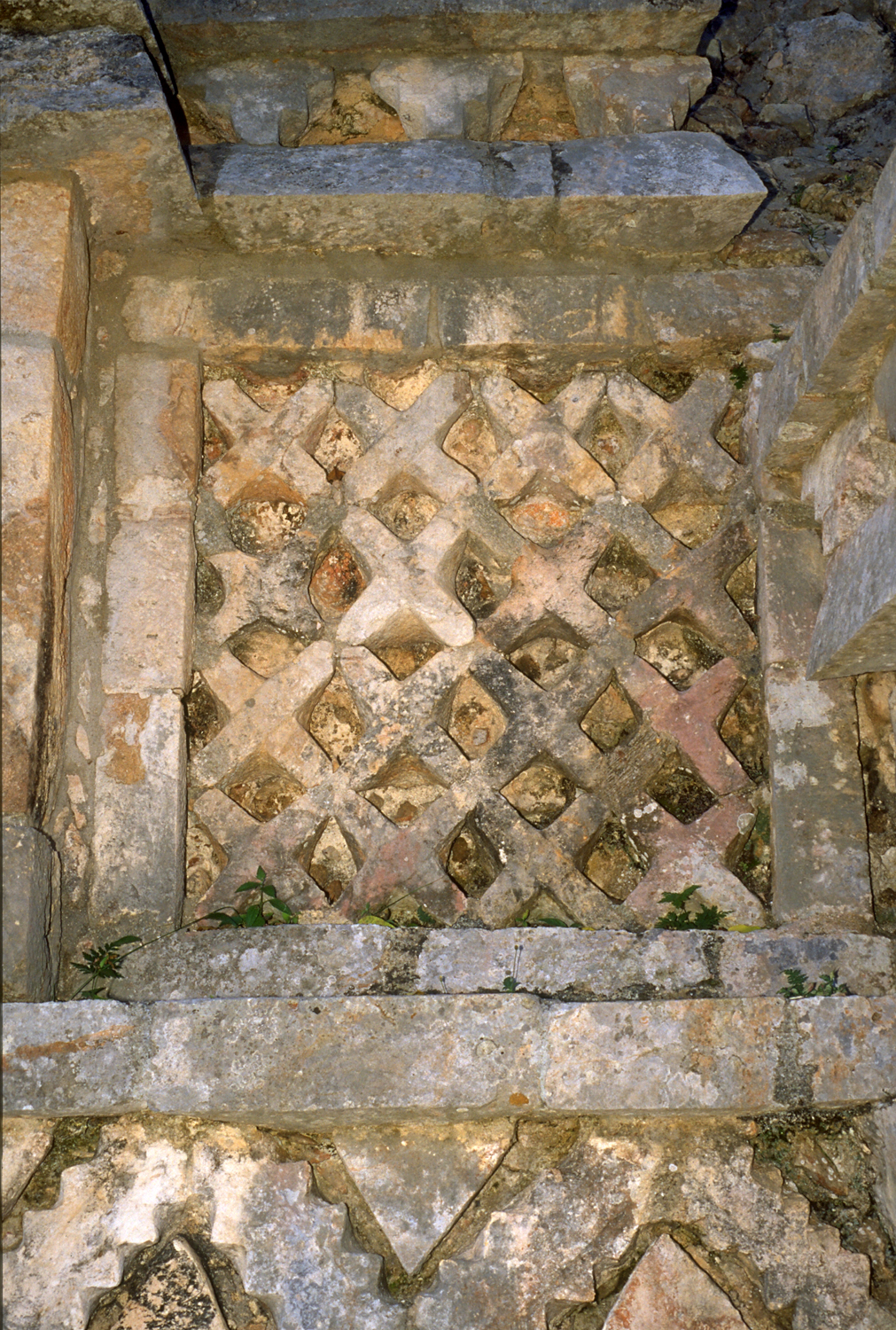 Lattice stonework at extreme right of this inner (northwest) face; diagonal overlaps suggest derivation from textile work.      Jan. 2001 (flash)