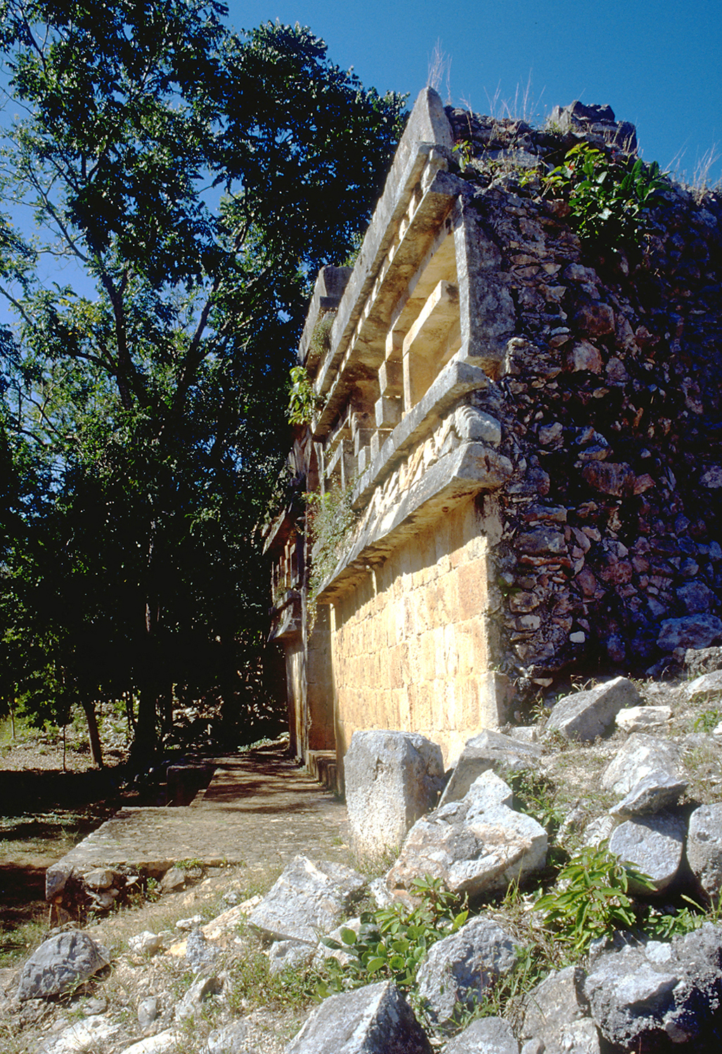 Looking along southeast face of Vaulted Archway, showing inclination, restored staircase, and facing stones tenoned to rubble core.