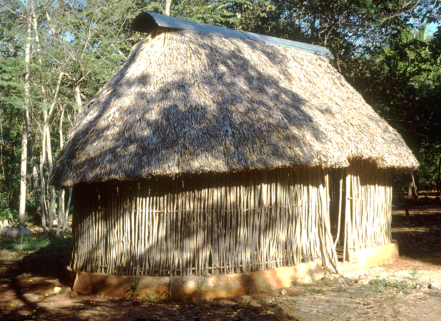 Characteristic Yucatec Maya thatched domestic hut; single room, rectangular with rounded, apsidal ends, central doorway in front.             Jan. 2001