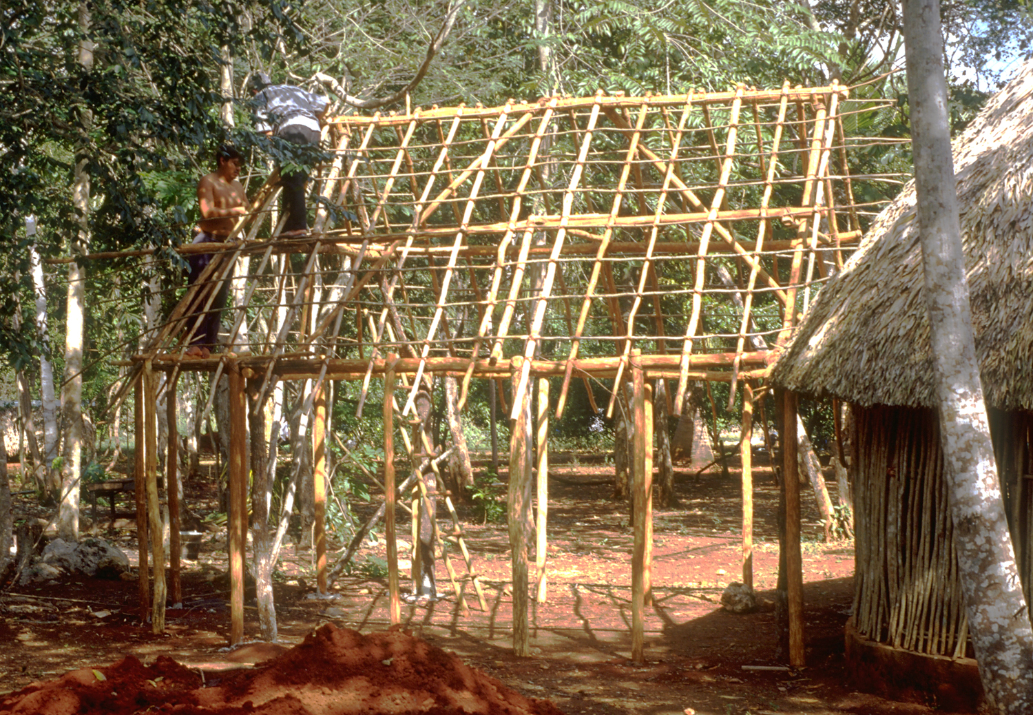 Framework of rear extension under construction, pile of red clay in foreground; compare photo at right.     Jan. 2002