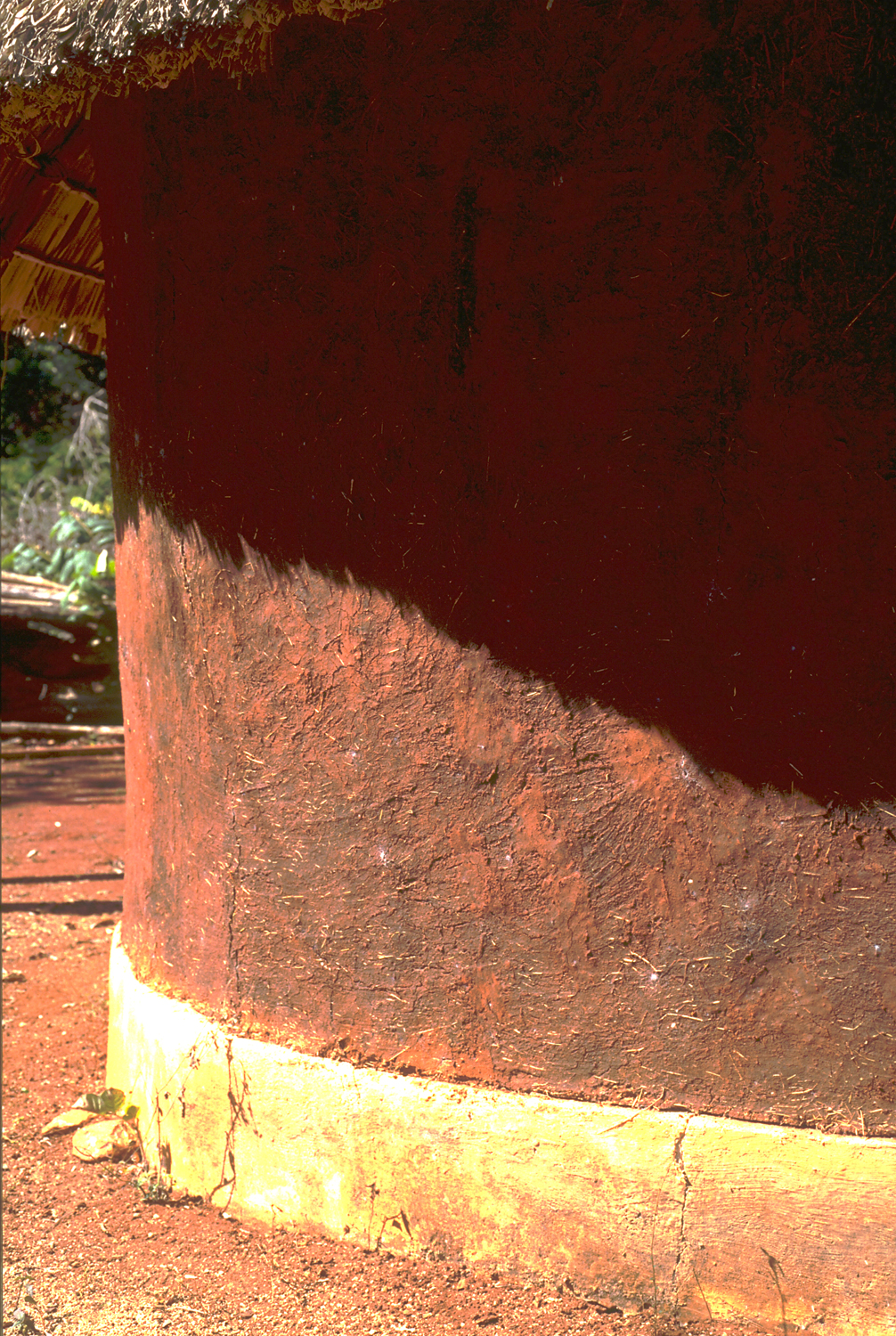 Wall detail of same thatched house, showing local clay covering of pole and stick walls, protected from moisture by limestone-mortar base.     Jan. 2003