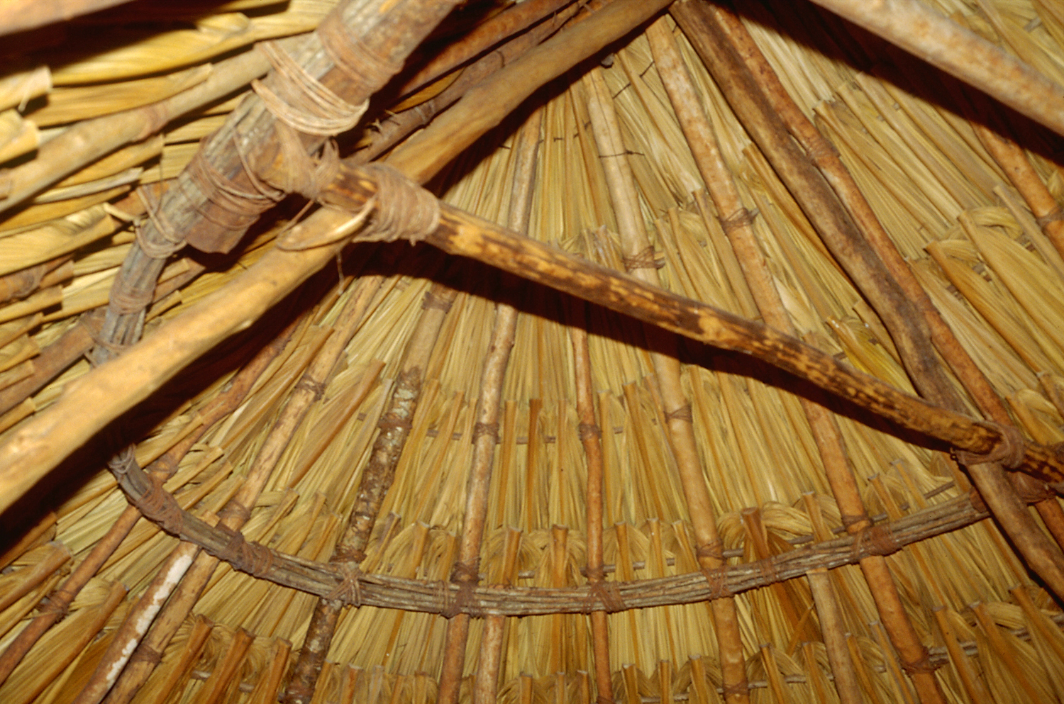 Interior of domestic hut in photos above-right, showing apsidal end of roof.   Jan. 2001 (flash)