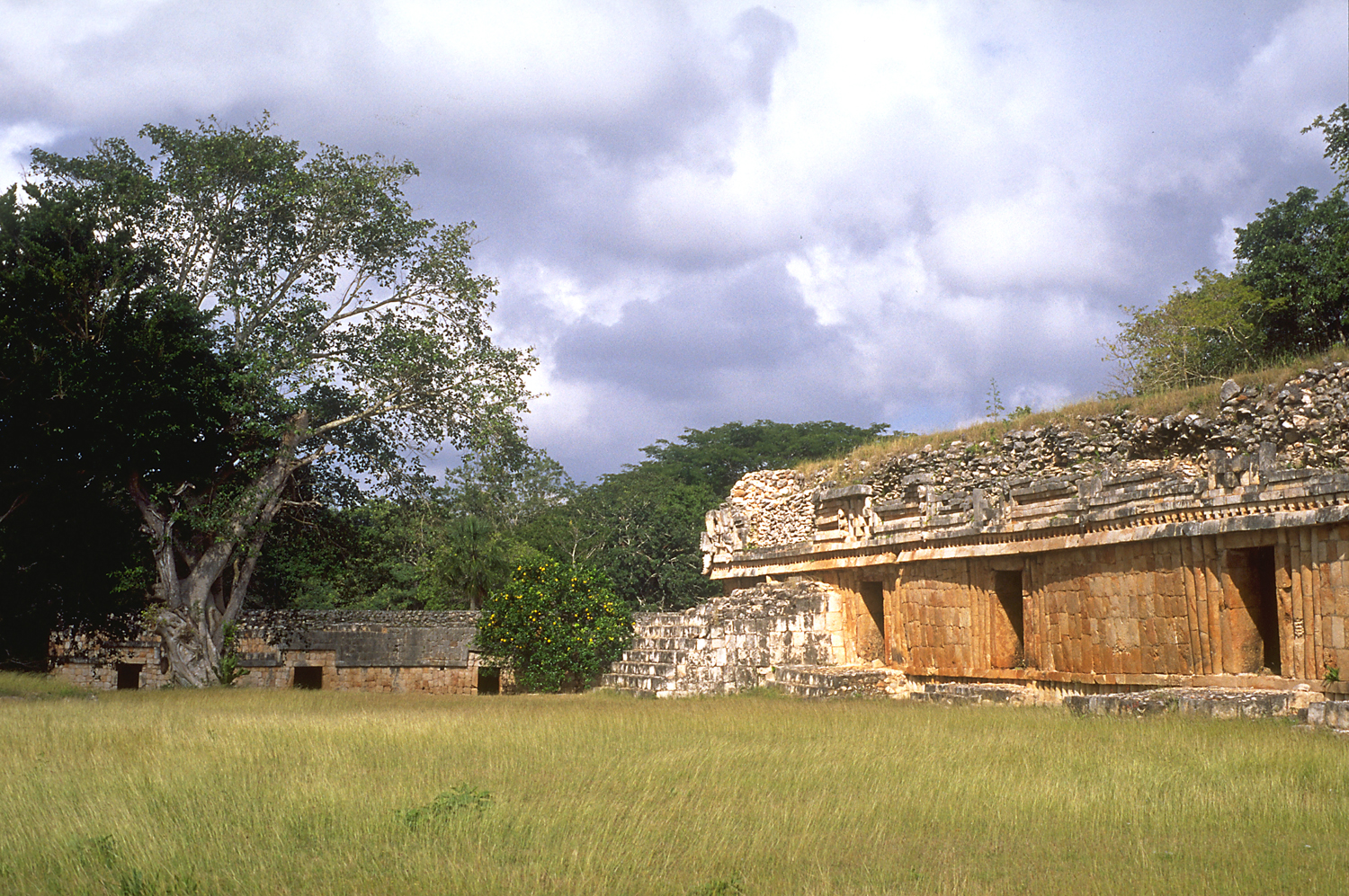 East structure, facade of left end with serpent mask, plaza and facade restored 1991-1992.       Jan. 2002