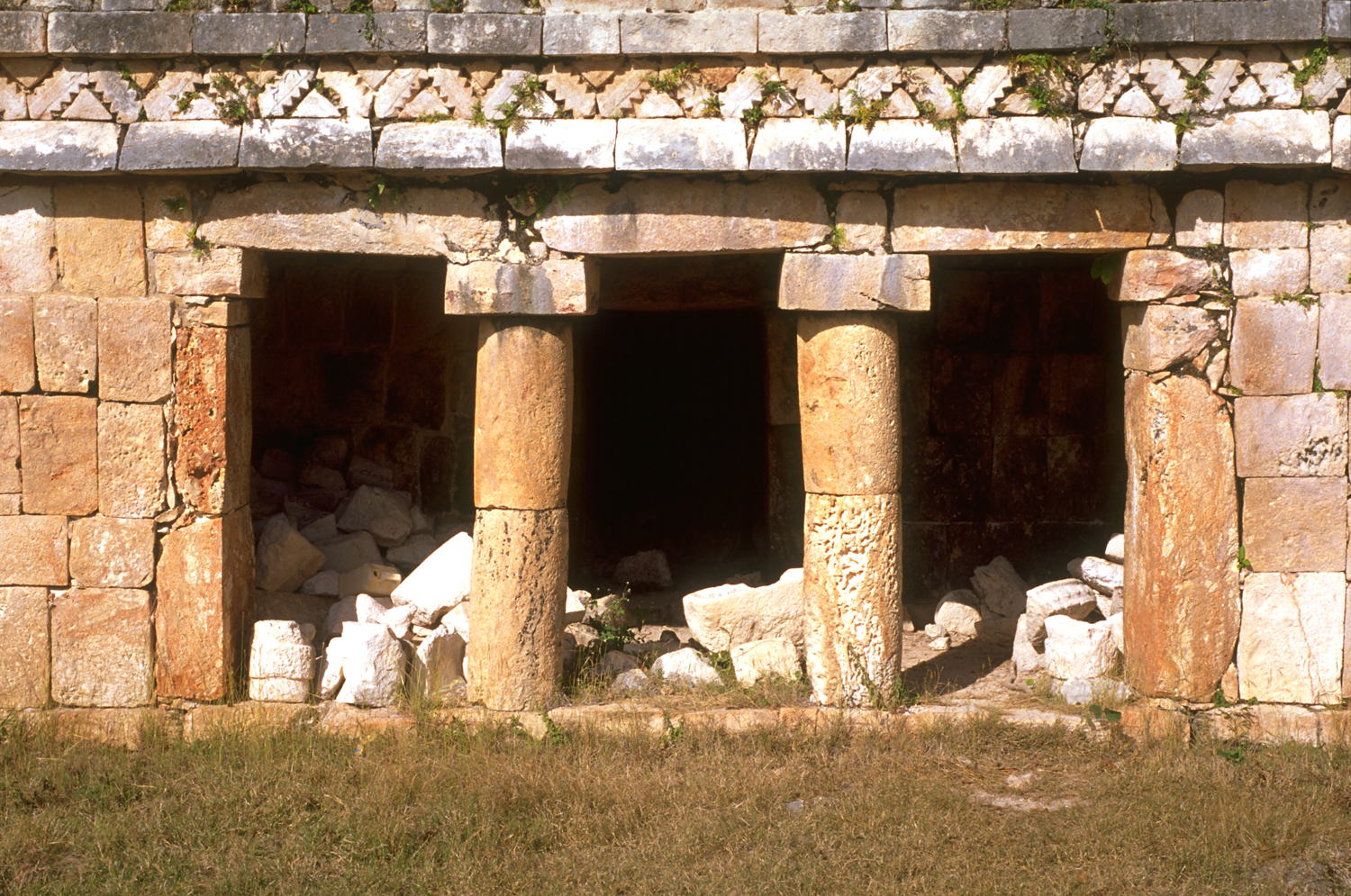 Large doorway in center of facade, each of two columns is composed of two drums, rectangular capitals and corbels (cf. restored elevation of same room in drawing at right).       Jan. 2002