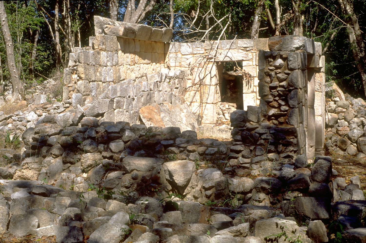 Partially standing structure farther back, cleared and explored 1996-1998.       Jan. 2001