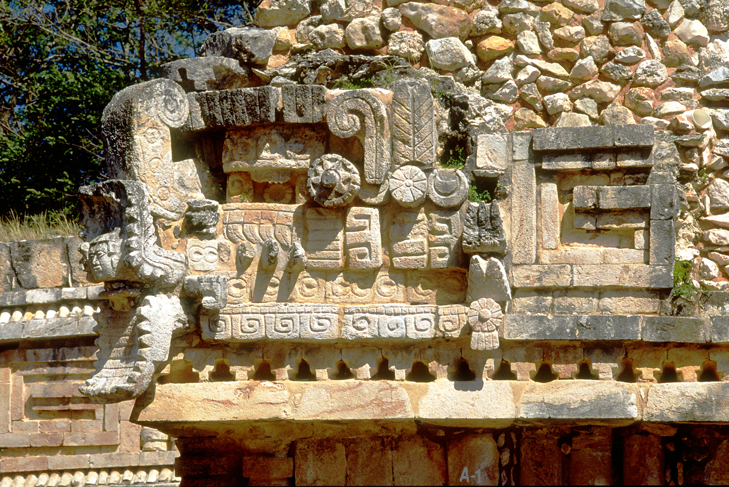 Same view as in 19th c. photo at left; showing southwest corner of east structure of Palace Group; famous corner sculpture of open serpent jaws with human head protruding; also showing other frieze details.       Jan. 2001