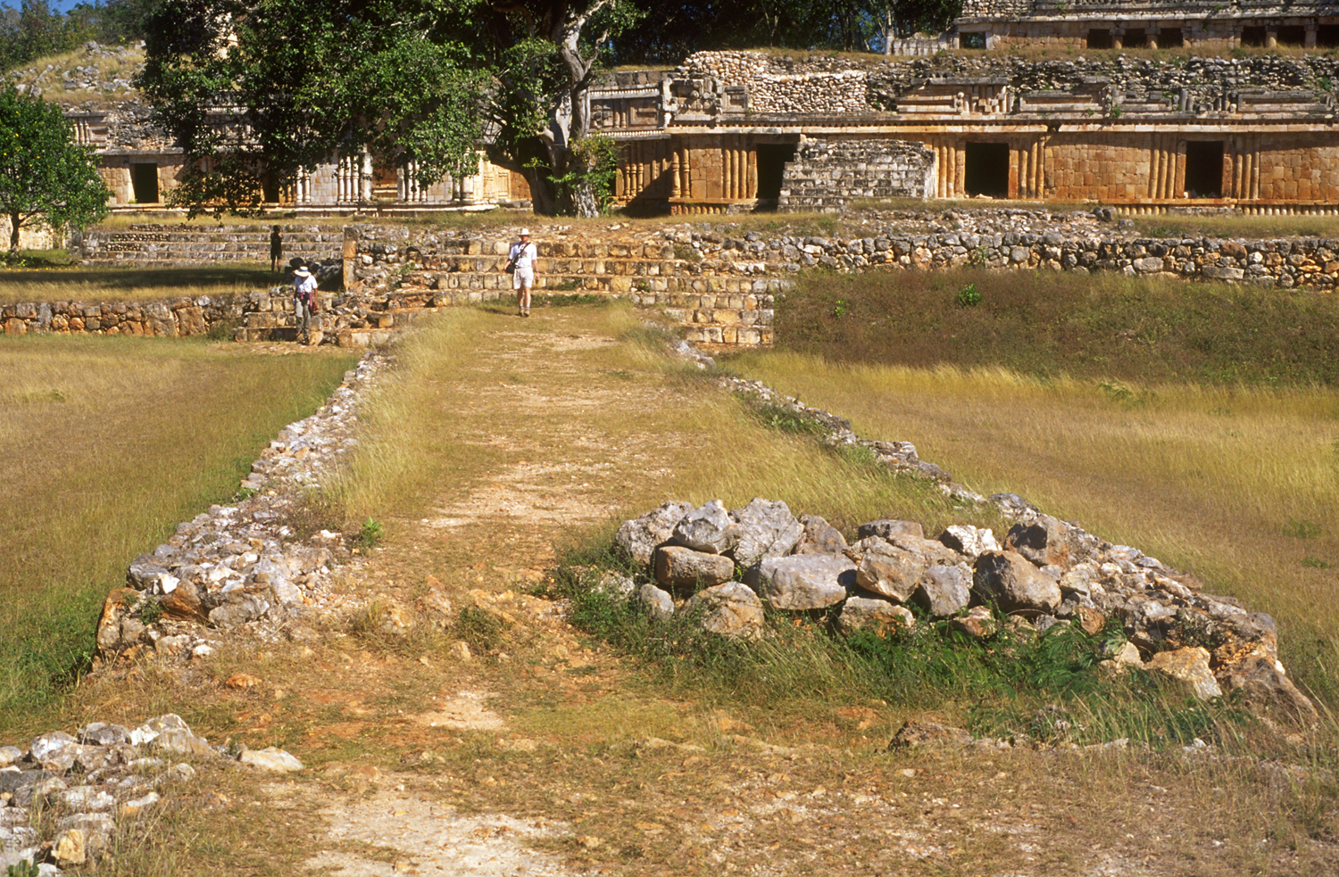 Showing width of sacbé, stone retaining walls at sides, with rubble fill and plaster surface.       Jan. 2001
