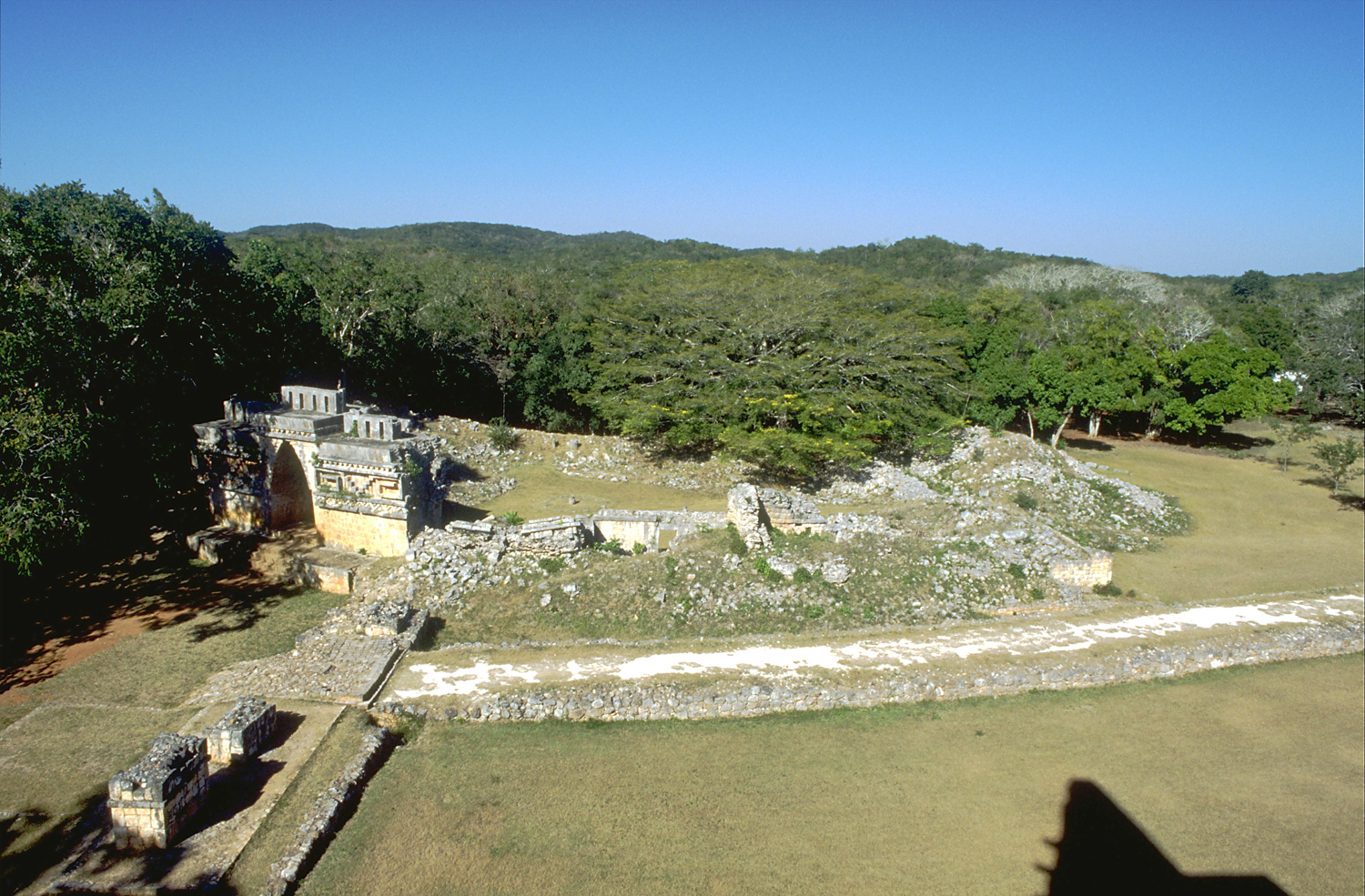 Sacbé leading to Central Plaza at left, seen from top of Pyramid Temple (El Mirador). Jan. 2003 (24 mm lens)
