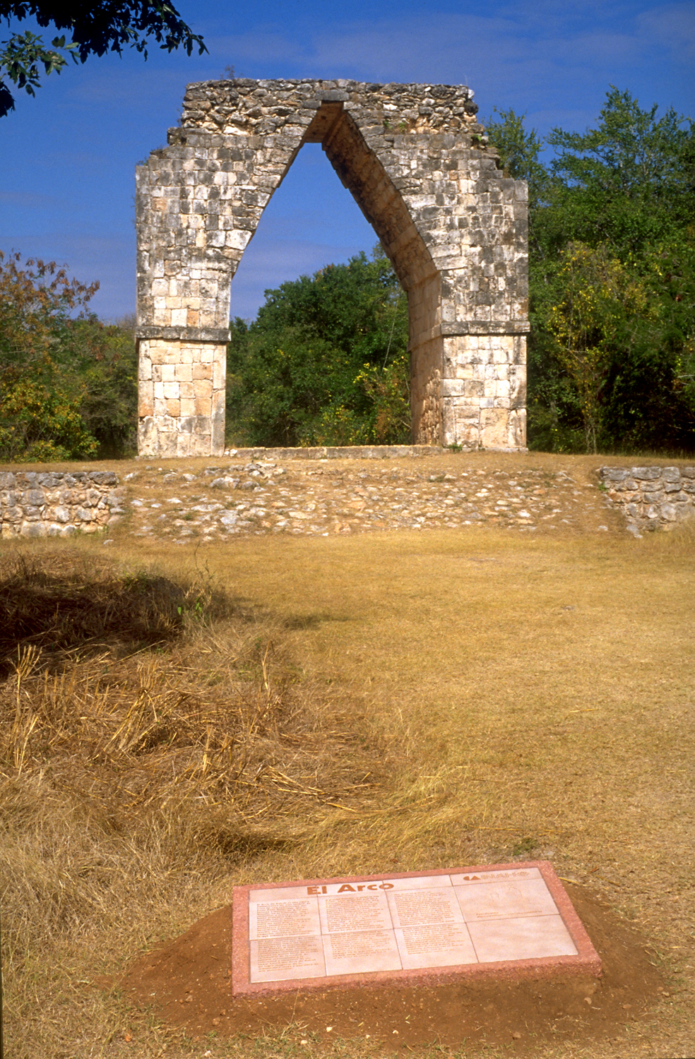 Kabah Arch, south face, INAH plaque in foreground.       Jan. 2001