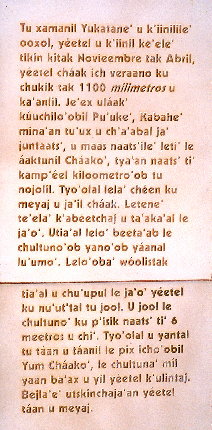 Detail of INAH plaque in photos above; Yucatec Mayan description.