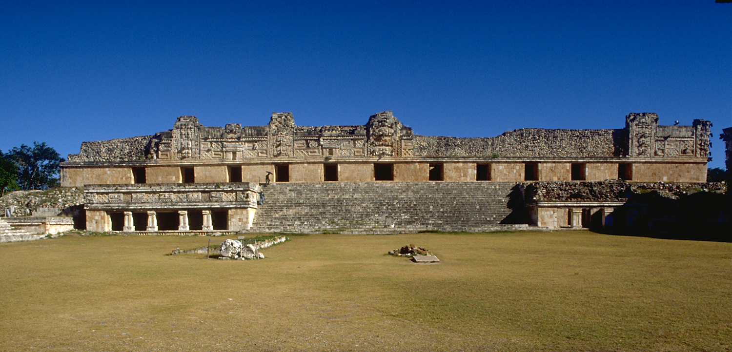 Uxmal, Nunnery, North Building. Spacing beside central doorway only slightly broader than between other doorways. Broad walls with no doorways at both ends of main facade. Behind these walls are rooms entered through doorways in ends of the building.       Jan. 2003 (24mm lens)
