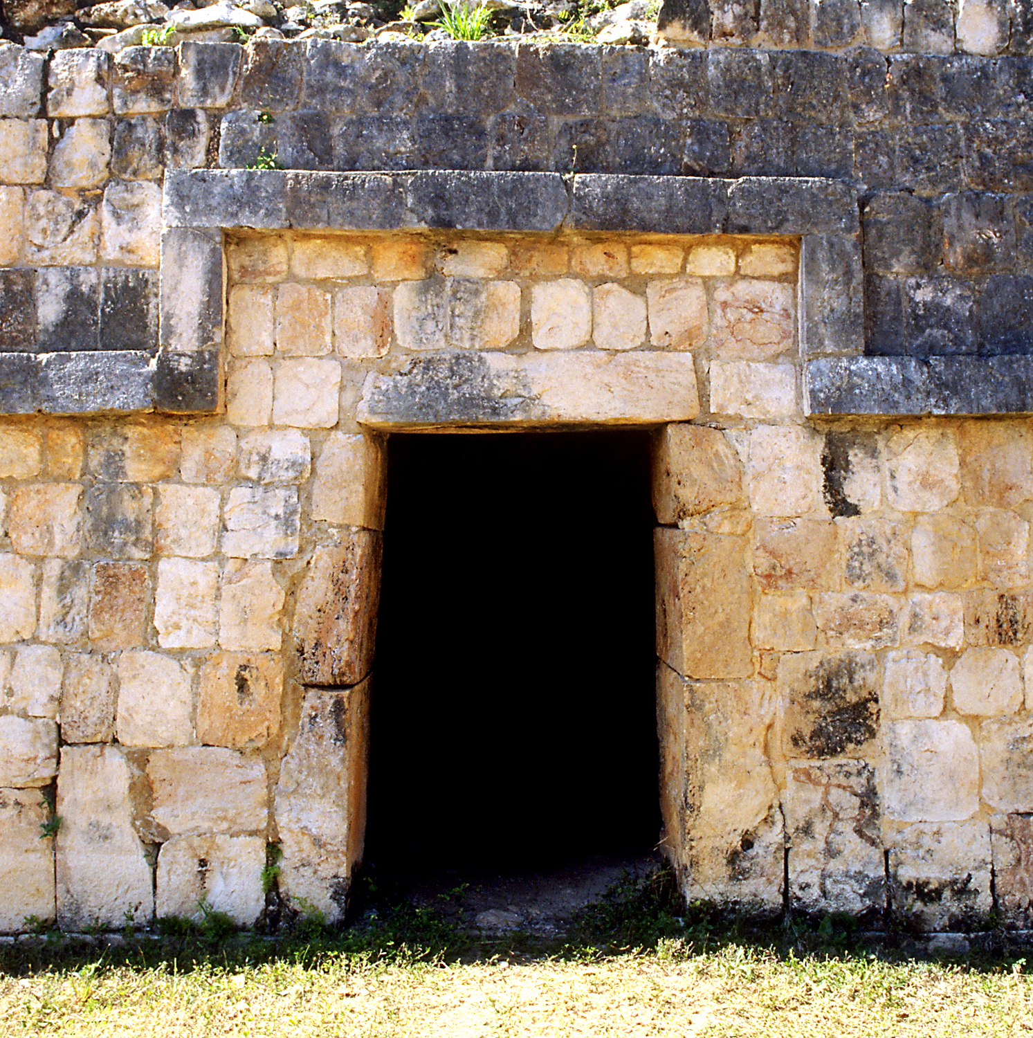 Labná, Palace Group, South Wing, East Facade. Second doorway from left, slightly tapered toward top, with medial molding rising over doorway.       Jan. 2002